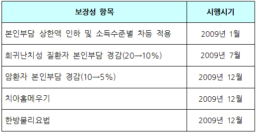 암환자의 입원과 외래 본인부담율을 현행 10%에서 5%로, 만성신부전증이나 류마티스 관절염 등 난치성환자의 입원과 외래 본인부담율도 현행 20%에서 10%로 낮추는 방안은 내년 7월부터 시행된다.