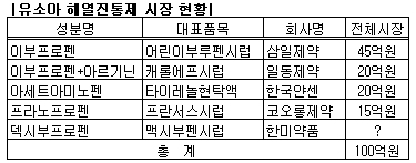 그동안 유소아용 해열진통제 시장은 교과서적 약물인 이부프로펜이 장악했고 실제 국내시장 100억원 중 절반 가까운 45억원을 차지하고 있다.