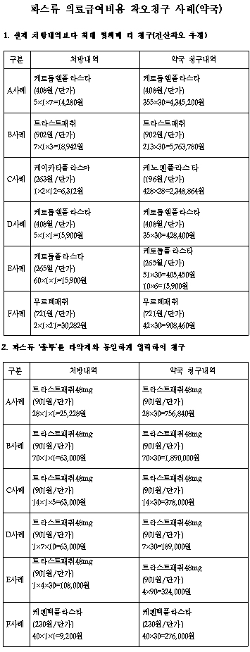 파스류에 대한 처방-청구내역 차이가 수백배에 이르러 약국의 착오청구에 대한 세심한 주의가 요구된다.
