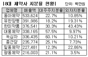 특히 일동제약은 외자 지분율이 22.8%인데 반해 대주주 지분율이 12.3%, 한미약품은 외자가 43.3%에 대주주 지분이 30.3%로 역전현상까지 나타났다.