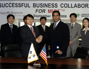 녹십자MS는 지난달 29일 미국 초정밀 계측기기 전문기업인 퀀텀 디자인(Quantum Design)의 자회사인 마그나바이오사이언스(MagnaBioSciences LLC.)와 기술이전 및 제품 공급-개발 계약을 체결했다.