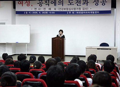 전 감사는 이날 ‘여성, 공직에의 도전과 성공’이라는 주제로 “산업화와 민주화 과정에서 여성의 사회·경제적 지위가 신장됐지만 국익을 위해서는 더 많은 참여가 있어야 한다”고 강조했다.