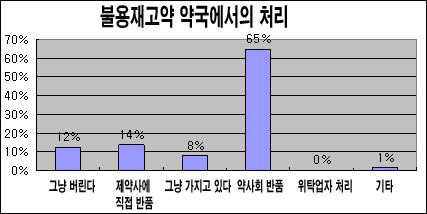 이어 약사 14%는 '제약사에 직접 반품한다'고 답했고 '그냥 버린다'는 약사도 12%나 됐다. 또 약사 8%는 '처리방법을 몰라 그냥 가지고 있다'고 응답했다.