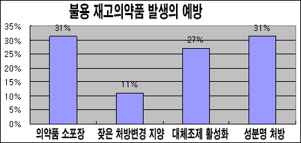재고약 예방을 위해 약사 31%는 '의약품 소포장' 도입을 꼽았고 '성분명 처방'이라고 답한 약사도 31%로 집계돼 동률 1위에 올랐다. 이어 '대체조제 활성화'가 27%, '잦은 처방변경 지양'이 11%로 나타났다.