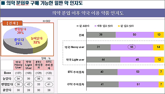 또 의약분업 후 약국 이용이 늘었다는 응답자는 32%이며 ‘병원에서는 약을 살 수 없기 때문’이라는 의견이 다수였고, 일반약 이용자 층은 예전과 비교해 변함없다는 의견이 41%였다.