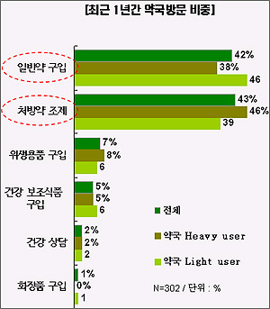 강남구약사회는 최근 6개월간 강남구, 서초구 소재 시민 302명을 대상으로 '소비자 약국 이용 실태조사'을 실시한 결과 최근 1년간 약국방문 비중에서 42%가 일반약을, 43%가 처방약을 조제하기 위해 약국을 이용했다.