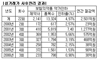 대상업체 및 약품수, 약가인하율, 보험재정 절감액 등 관련 변수가 모두 급감한 것은 복지부가 2000년 이후 지속해 온 실거래가 사후관리로 약가거품이 일정부분 제거됐음을 의미하는 것으로 분석된다.