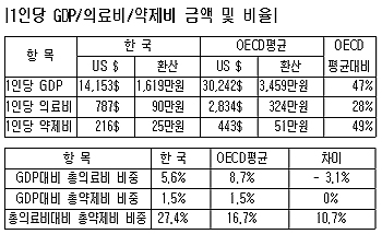 실제 OECD 국가들은 1인당 51만원을 지출, GDP(3,459만원) 대비 1.5%를 약값으로 지출했다.