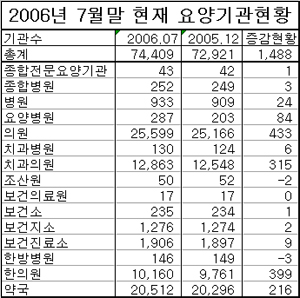 17일 심평원의 요양기관현황 자료에 따르면 7월말 현재 전체 요양기관 수는 총 7만2,921곳으로 지난해 12월말 대비 1,488곳이 늘어났다. 월평균 212곳이 새로 문을 연 셈이다.