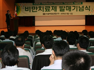국제약품은 12일 대한송유관공사 인력개발원에서 영업부문 임직원이 참석한 가운데 비만치료제 신제품 4종 발매 기념식을 갖고 매출목표 70억원 달성을 다짐했다.