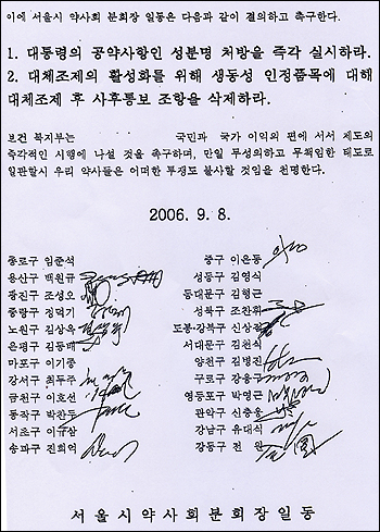 구약사회장 일동은 "복지부는 국민과 국가 이익의 편에 서서 제도의 즉각적인 시행에 나설 것을 촉구하라"며 "만일 무성의하고 무책임한 태도로 일관할시 우리 약사들은 어떠한 투쟁도 불사할 것"이라고 밝혔다.