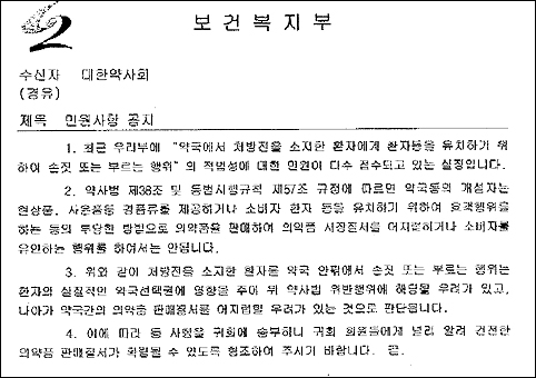 복지부가 최근 대한약사회에 보낸 공문에 따르면 약국에서 처방전을 소지한 환자에게 '손짓'을 하거나 환자를 '부르는 행위'의 적법성에 대한 민원이 다수 접수되고 있다며 건전한 의약품 판매질서가 확립될 수 있도록 적극 협조해 달라고 당부했다.