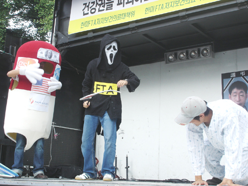 한편 이날 집회에서는 약대학생들이 병에 걸린 평범한 셀리리맨이 FTA를 통해 어떤 위협에 노출돼 있는지 상징적으로 표현한 퍼포먼스를 선보여, 참가자들로부터 큰 호응을 얻기도 했다.