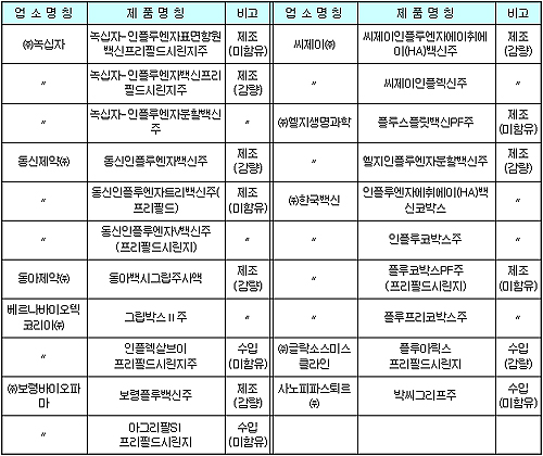 또 ▲동아제약 백시플루주사액 ▲베르나바이오텍코리아 그립박스Ⅱ주 ▲인플렉살브이 프리필드시린지주 ▲보령바이오파마 보령플루백신주 ▲아그리팔S1 프리필드시린지 ▲씨제이 인플루엔자에이취에이(HA)백신주 ▲씨제이인플렉신주 ▲엘지생명과학 플루스플릿백신PF주 ▲엘지 인플루엔자분할백신주 ▲한국백신 인플루엔자에취에이(HA)백신코박스 ▲인플루코박스주 ▲플루코박스PF주(프리필드시린지) ▲플루프리코박스주 ▲글락소스미스클라인 플루아릭스 프리필드시린지 ▲사노피파스퇴르㈜ 박씨그리프주도 포함됐다.