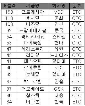 또 세레스톤지(47억원), 라미실(43억원), 박트로반(37억원), 찹스틱(36억원) 등은 10대 제품에 포함된 것으로 파악됐다.
