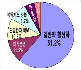또한 약사 61.2%는 약국 경영활성화 차원에서 가장 필요한 요소는 '일반약 활성화'를 꼽았다. 이어 '건식·화장품 등 다각경영'이 11.2%, '단골환자 확보' 10.8%, '복약지도 강화' 8.7% 순 이었다.