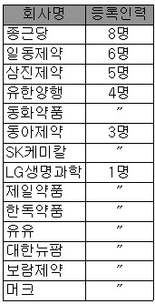 종근당에 이어 일동제약이 6명으로 뒤를 이었고 삼진제약(5명), 유한양행·동화약품(4명), 동아제약·SK케미칼(3명) 등도 2명 이상의 인력이 등록된 것으로 나타났다.