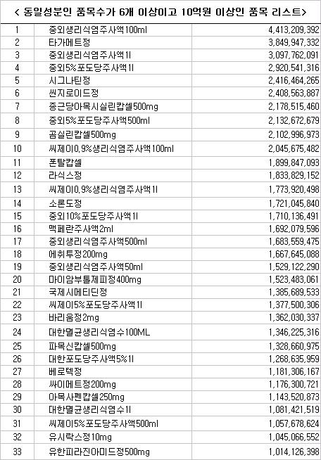 중외제약 '중외생리식염주사액100ml'(44억1,320만원), 유한양행 '타가메트정'(38억4,994만원), 동화약품 '시그나틴정'(24억1,646만원), 부광약품 '씬지로이드정'(24억856만원), 종근당 '종근당아목시실린캅셀500mg'(21억7,851만원) 등이 여기에 포함돼 있다.