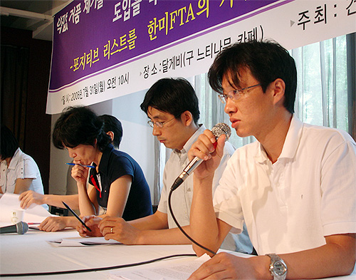 최인순 한미 FTA저지 보건대책위 공동집행위원장 i이날 회견에 참석한 최인순 한미 FTA저지 보건대책위 공동집행위원장은 노무현 대통령이 최근 의약품 분야를 포함한 4대 선결조건에 대한 표현을 수용한다고 발언한 것과 관련, 국면 전환용 정치적 수사로 보인다고 우려를 표명했다. 최 집행위원장은 “외통부나 재경부는 그동안 4대 선결조건 합의 의혹에 대해 사실이 아니다고 부인해 왔는데, 대통령이 갑자기 이를 뒤집는 발언을 했다”면서 “FTA협상에서의 국면전환을 위한 고도의 정치적 술수가 아닌가 우려스럽다”고 말했다. 선결조건부 합의가 있었음에도 불구하고, 포지티브 제도를 시행하는 만큼 미국 측의 다른 요구사항에 대한 양보가 불가피하다는 논리를 펴기 위한 계산이 깔려 있을 수 있다는 주장. 그는 “특허기간 연장, 약가결정 과정에서의 제약사 참여, 비위반제소 등 포지티브 리스트제를 무력화시킬 수 있는 요소들이 FTA 현안과제로 도처에 산적해 있다”면서 “정부가 진정으로 합리적인 약가정책을 운영하고 싶다면 포지티브제를 두더기로 만들 수 있는 요소들을 가감히 제어해야 한다”고 강조했다. 또한 “국민건강과 관련한 제도는 국가의 주권의 영역으로 협상 대상이 될 수 없다는 원칙을 강조해 온 유시민 장관의 반언도 정치적 수사가 아닌 양심과 소신에 기반한 발언이었기를 바란다”고 말했다.