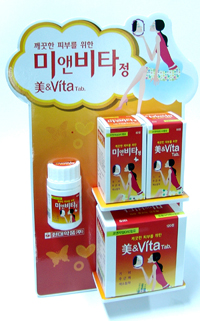 제품명인 미앤비타는 '비타민 복용으로 아름다워지자'라는 의미를 갖고 있으며 연두색의 원형 필름 코팅정이다. 1일 2정 복용.