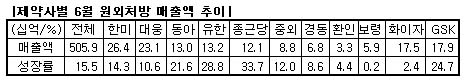 매출액 측면에서는 한미약품이 264억원으로 1위였으며 대웅제약(231억원), GSK(179억원), 화이자(175억원), 유한양행(132억원), 동아제약(130억원) 순이었으며 6월 총 매출액은 5,059억원으로 성장세를 보였다.
