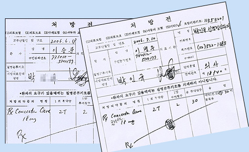 여기에 유령 의원인 '박인규 신경정신과의원'을 처방권자로 이용하고 있고 가짜 도장을 판 뒤 처방전에 날인도 하고 있다.