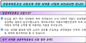 생물학적동등성 시험조작 관련 의약품 이렇게 처리하시면 됩니다. -생물학적동등성 시험이란? *최초로 허가 받은 의약품과 복제 의약품간의 인체 내에서 약효가 동일함을 입증하는 일종의 임상시험으로써, 제약회사에서 식품의약품안전청에 복제 의약품의 허가를 신청할 때 제출하는 자료중 하나입니다. *이는 의약품 품질에 대한 소비자 신뢰를 제고하고, 의약분업의 안정적 시행을 위하여 필수적이라 할 수 있습니다. -일부 의약품 생물학적동등성 시험 결과 조작!! *식품의약품안전청에서는 생물학적동등성시험 결과에 대한 신뢰성을 확보하고 시험기관의 전반적인 현황 및 문제점을 파악하고 그 결과를 토대로 시험기관의 운영상 나타난 문제점을 개선하기 위하여 지도 점검 하던 중, 일부 시험기관에서 시험한 품목에 대하여 생동성 시험자료를 조작한 혐의가 있어 추가로 허가취소 및 판매금지, 대체조제 금지 및 시중 유통품 회수·폐기 조치하기로 결정하였습니다. -생물학적동등성 시험조작 관련 의약품 이렇게 처리하시면 됩니다. *복용중인 분: 처방을 받은 병/의원을 방문하여 의사와 상의하여 다른 의약품으로 변경(수정)된 처방전을 받은 후, 약국에 가서 의약품을 교환하시면 됩니다. *병·의원: 소비자가 문제 의약품을 처방받아 복용하고 있는 것이 확인 되면 (처방전 또는 약을 제시할 경우) 진료비를 추가로 받지 말고 다른 약으로 처방전을 변경(수정)하여 줍니다. *약국: 소비자가 수정된 처방전을 제시하면 약값을 추가로 받지 말고 다른 약으로 바꾸어 줍니다. 또한 소비자로부터 반납받은 약은 해당 제약회사 또는 도매상으로 반품합니다. *제약회사: 약국 또는 도매상이 약의 반품을 요청할 때에는 적극 협조하고 반품 및 회수한 약은 폐기하시기 바랍니다. -생물학적동등성 시험 결과 조작 의약품 인체에 유해할까? *신약이나 안전성·유효성이 검증되지 아니한 의약품을 허가 받고자 할 경우 당해 의약품이 인체에 안전하고 유효함을 입증하는 자료를 첨부하여 식약청장에게 제출하도록 되어있고, 식약청에서는 제약회사에서 제출한 19종의 안전성·유효성을 입증하는 자료가 관련규정에 적합한지 여부를 검토하여 적합할 경우에만 허가하고 있으며, *이중 생동성시험자료는 안전성·유효성을 입증하는 자료의 일부로서 최초로 허가 받은 의약품(대조약)과 복제 허가를 받고자 하는 의약품(시험약)간의 약효가 동일함을 입증하는 일종의 임상시험 자료로써, 금번 문제 의약품은 국내외에서 허가되어 오랫동안 사용한 의약품이므로 안전성에는 별다른 문제가 없을 것으로 판단됩니다. *또한, 모든 의약품은 KGMP(우수의약품제조및품질관리기준) 공장에서 만들고 있고, 식약청에서는 매년 지속적으로 수거·검정을 실시하여 품질관리에 철저를 기하고 있으므로 시중에 유통되는 의약품의 품질은 걱정하지 않으셔도 됩니다.