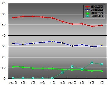 지난해 말 자이데나의 시장 진입으로 점유율 구도에 일대 변화가 예상됐지만 나머지 3사가 적극적인 시장 방어전략을 구사하면서 점유율 변화폭이 점차 줄어드는 양상이다.