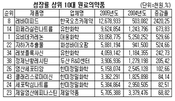 또 한국오츠카제약의 위염·위궤양 치료제 원료인 레바미피드(127억원)가 2420.2%로 가장 높은 성장률을 보였으며 유한화학의 항생제 피페라실린나트륨(96억원)도 673.8%로 나타났다.