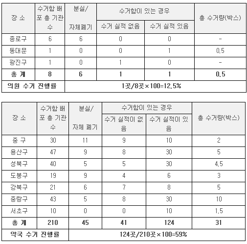 병의원의 경우 참여 기관 총 8곳 중 7곳은 수거함이 분실되거나 수거 실적이 없어 자체 폐기했다.
