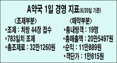 일평균 처방은 40건대. 중장기 처방이 많다. A약국의 하루 평균 매약마진은 20만원을 웃도는 수준으로 이를 합산하면 월 평균 조제료 700만원에 매약 마진 400만원이 된다.