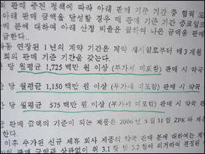 이번 수정계약서에서는 이를 17억2,500만원(부가세 제외), 11억5,000만원, 5억7,500만원 이상 판매시에 분기단위로 연 4회 같은 비율의 판매장려금을 지급한다는 것.