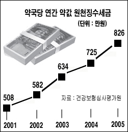 약국당 연간 약품비에 대한 원천징수세금은 2001년 508만원에서 2002년 582만원, 2003년 634만원, 2004년 725만원으로 매년 급증하고 있다.