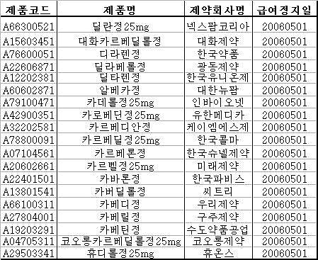 30일 심평원에 따르면 추가 급여정지 대상에는 식약청이 지난 25일 대체처방가능 의약품 목록(184품목)으로 제시한 영일제약의 고혈압약 '카베론정25mg' 64개 대체품목 중 16개 품목이 포함돼 있다.