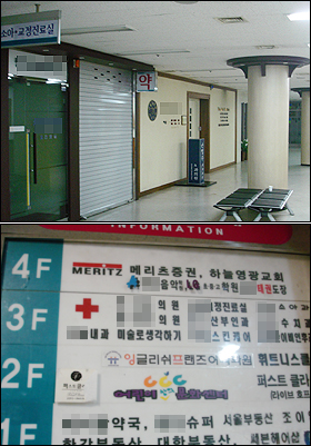 층약국이 들어선 3층은 이른바 병원층으로 산부인과, 이비인후과, 치과 등 의원이 몰려있지만 약국과 의원들 사이에 어떤 업종도 없어 기본적인 약사법마저 위반하고 있다.