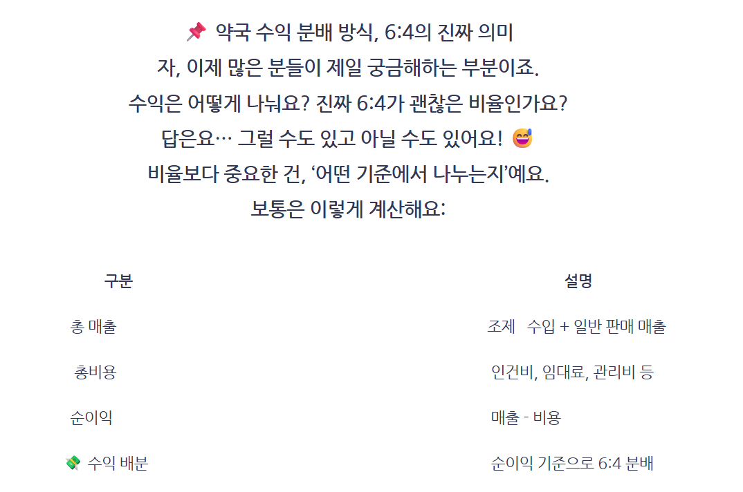 약사와 투자자·본사가 함께 약국을 운영하고 수익을 나누는 구조로, 투자자 쪽이 60%, 약사 쪽이 40%를 가져가는 '꽤나 현실적인 운영 방식'이라는 설명입니다. 투자자·본사가 자본과 공간을 제공하고 약사는 조제·복약지도 등 약사 업무를 담당한다는 겁니다.
