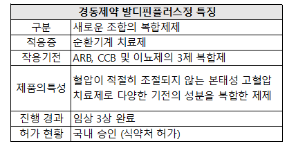 최근에는 '발디핀플러스정' 4개 용량 제품에 대한 식품의약품안전처 허가를 획득했다. 발디핀플러스정은 칼슘채널차단제(CCB) 계열인 암로디핀, 안지오텐신 수용체 차단제(ARB) 계열 발사르탄, 설폰아미드계 이뇨제 클로르탈리돈을 함유한 3제 복합제다.