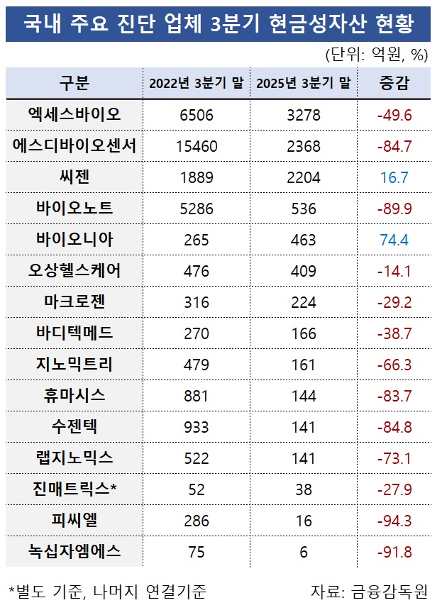 4일 금융감독원에 따르면 올 9월 말 기준 국내 주요 상장 진단 업체 15곳의 현금 및 현금성 자산은 총 1조295억원이다. 이는 진단키트 호황기였던 2022년 9월 말 총 3조3698억 대비 약 70% 감소한 수준이다.