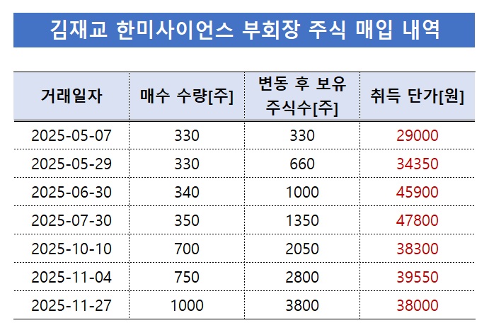 특히 김 대표는 취임 이후 책임경영 의지를 대내외적으로 보여주는 행보를 이어가고 있다. 지난 6개월간 한미사이언스 주식 3800주를 장내에서 꾸준히 매입했다. 이 과정에서 투입한 개인 자금만 1억4771만 원에 달한다. 그룹 차원의 기업가치 제고 전략을 총괄하는 동시에 직접 지분을 늘리며 장기적 성장 비전에 대한 확신을 시장에 전달했다는 해석이 나온다.
