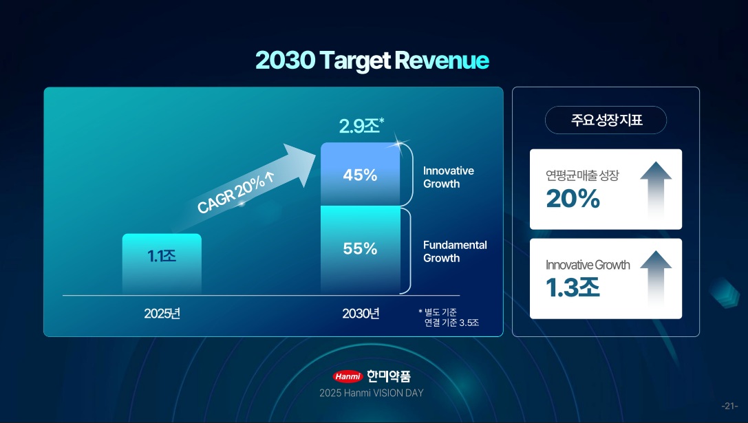 재무 목표도 한층 공격적으로 상향했다. 한미약품은 2030년까지 별도 기준 매출을 2025년 1조1000억원에서 2조9000억원으로, 연결 기준 매출은 1조5000억원에서 3조5000억원으로 확대하겠다는 목표다. 글로벌 사업 확장과 신약 출시 전략에 기반2025~2030년 동안 연평균 20% 이상 성장하겠다는 포부다. 별도 기준 영업이익률은 2030년 20% 이상으로 잡아 수익성 개선 목표도 명확히 했다.