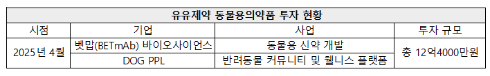 유유제약은 올 3월 정기 주주총회에서 동물의약외품, 동물건강기능식품, 동물용품 등 제조·판매업을 사업목적에 추가했다. 이후 미국 수의학 바이오제약 기업 '벳맙 바이오사이언스(VETMAB BIOSCIENCES)'와 반려견 전용 커뮤니티서비스인 '독 피플(DOG PPL)'에 투자를 단행했다. 유망 기업 투자를 통해 시장 진입 속도를 높이겠다는 전략으로 풀이된다.