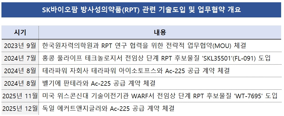 RPT는 이들 플랫폼 중 가장 구체적인 진척이 이뤄지고 있는 분야다. SK바이오팜은 2023년 한국원자력의학원과의 연구협력을 시작으로 지난해 7월 RPT 치료제 후보물질 'SKL35501'(FL-091)을 도입하면서 본격적인 RPT 사업 구축에 나섰다. 이어 테라파워·판테라와 방사성 동위원소 악티늄-225(Ac-225) 공급 계약을 맺었다. 최근에는 미국 위스콘신대 기술이전기관으로부터 두 번째 후보물질 'WT-7695'를 도입했고 독일 에커트앤지글러와 Ac-225 공급 계약 추가로 체결하면서 원료 조달망을 확장했다.