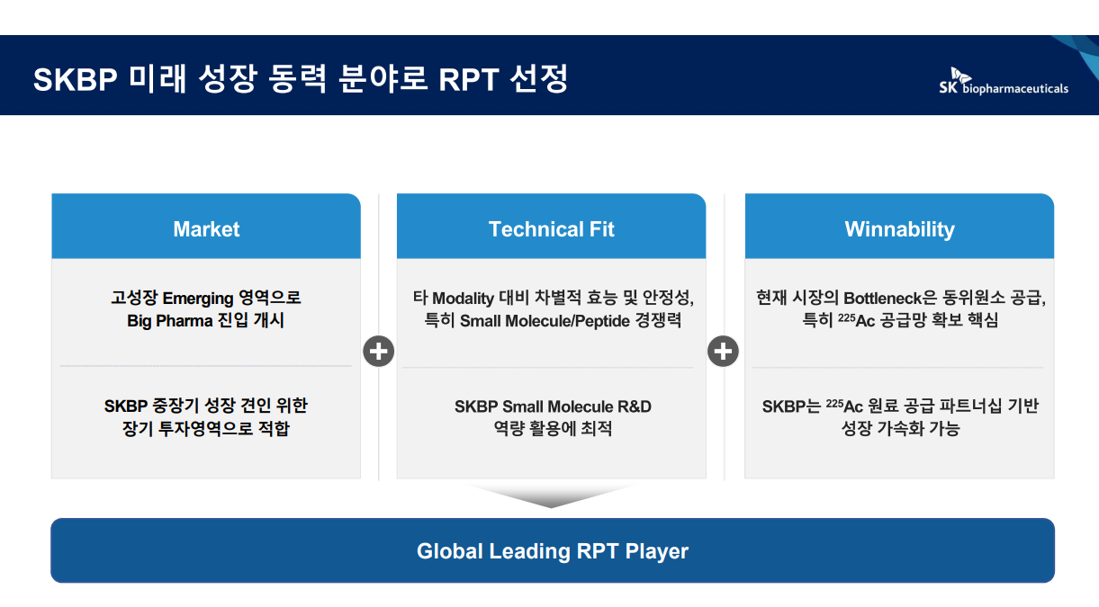 SK바이오팜 입장에서 RPT는 충분히 해볼 만한 사업으로 평가된다. RPT는 항체나 저분자화합물에 방사성 동위원소를 붙이는 방식이다. 차세대 플랫폼이면서도 SK바이오팜이 세노바메이트 개발로 축적한 합성의약품 신약개발 역량을 연계해 시너지를 낼 수 있는 분야다. RPT 치료제는 어떤 방사성 동위원소를 사용하는지에 따라 알파(α)선 기반 치료제와 베타(β)선 기반 치료제로 나뉘는데 SK바이오팜은 치료 효과가 강력하고 미충족 수요가 큰 알파핵종 기반 RPT로 차별화를 꾀할 예정이다.