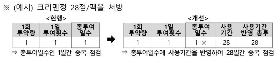 앞으로는 총 투여일수 옆에 사용기간이 반영된다. 가령 28정/팩 단위라면 사용기간에는 28이 기재된다. 따라서 팩 단위 제제 사용기간인 28일에 대해 중복 점검이 수월해지는 것이다.