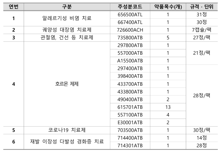 알레르기성 비염치료, 호르몬제제, 코로나19 치료제 등 주성분코드 18개, 39개 품목에 변경된 기준이 적용된다.
