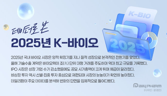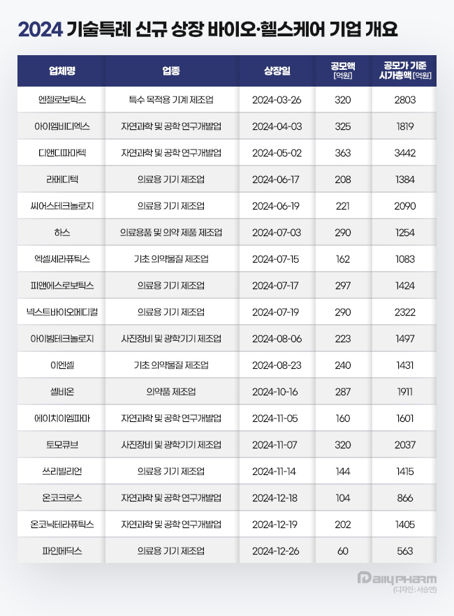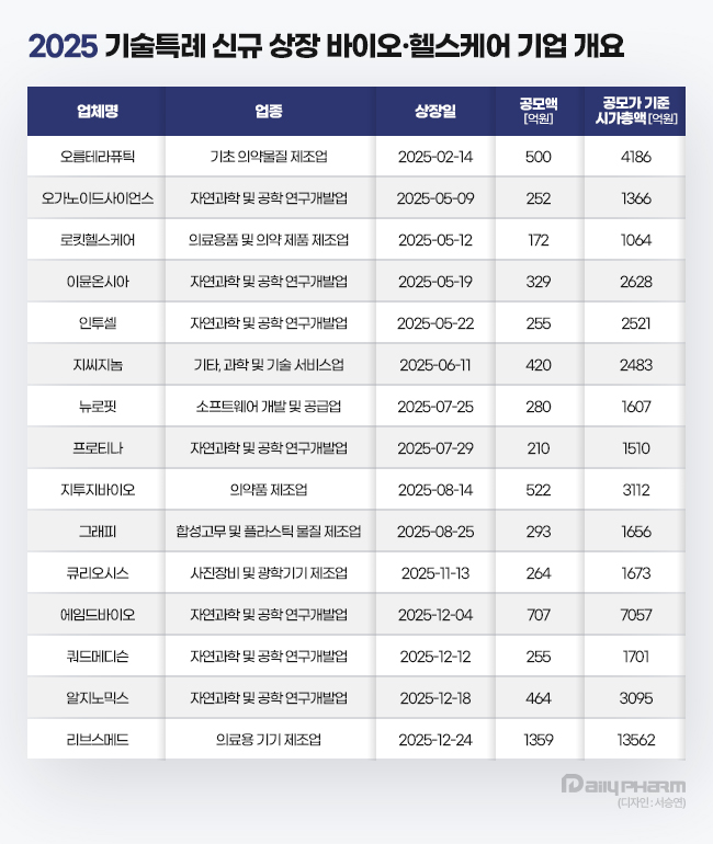[데일리팜=차지현 기자] 올해 바이오 기업공개(IPO) 시장은 기술력 중심 선별 기조가 강화되며 '옥석 가리기' 흐름이 뚜렷하게 나타났다. 기술특례 신규 상장 바이오·헬스케어 기업 수는 전년보다 감소했지만 총 공모액과 시가총액은 크게 증가했다. 또 의료기기와 소재·부품·장비(소부장) 기업 상장이 주를 이뤘던 작년과 달리 올해에는 신약개발과 플랫폼 기반 바이오텍의 약진이 두드러졌다.