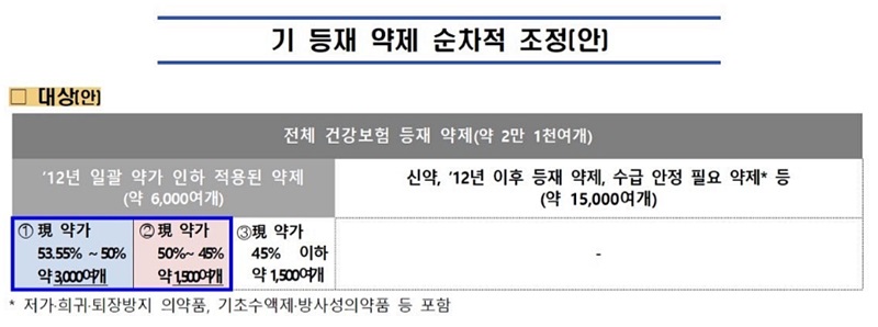 2012년 당해년도 일괄 약가인하 이후 현재(2025년)까지 약가 조정·인하가 전혀 되지 않았거나, 소폭 인하된 품목 4500개에 대해서만 제한적으로 제네릭 약가 산정률을 53.55%에서 40%대로 낮추는 게 핵심 내용이다.