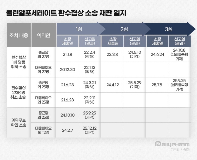 제약사들의 콜린제제 환수협상 계약 무효 소송은 2개 그룹으로 나눠 진행됐다. 법무법인 세종이 종근당 등 24곳의 사건을 맡았고 법무법인 광장이 대웅바이오 등의 소송을 대리했다. 종근당 등은 지난 9월 패소했고 현재 항소심이 전개 중이다.