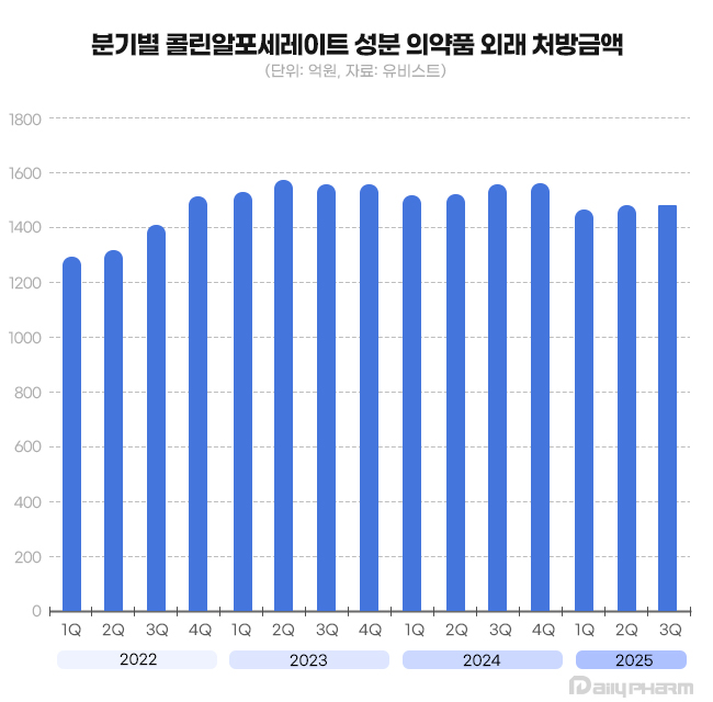 콜린제제의 지난해 콜린제제의 외래 처방금액은 6123억원으로 집계됐다. 올해 3분기 누적 처방 시장 규모는 4419억원으로 나타났다. 최근 시장 성장세는 주춤했지만 여전히 3개월 처방액이 1500억원에 육박하는 초대형 시장을 형성했다.