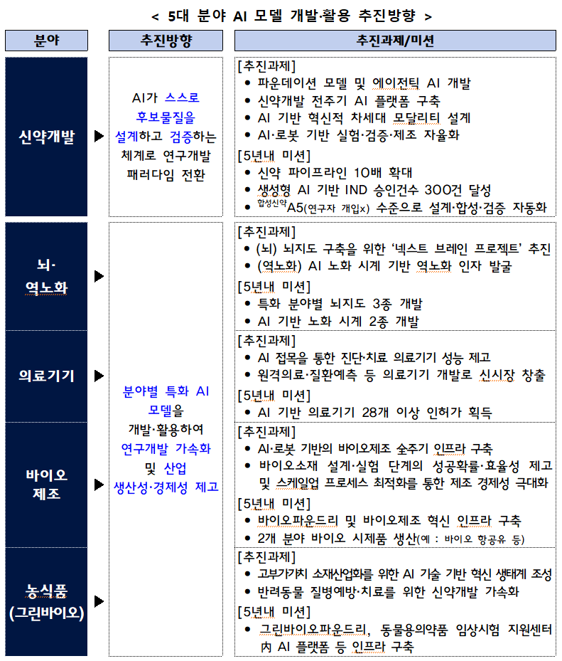 AI 적용 가능성과 파급효과를 고려해 5대 핵심 분야를 선정해 AI 바이오 모델을 구축한다. 5개 분야는 ▲신약개발 ▲뇌·역노화 ▲의료기기▲바이오제조 ▲농식품(그린바이오)이다.